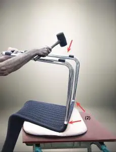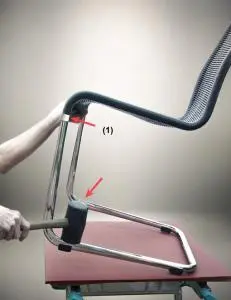 Legen Sie die Sitzfläche auf eine gepolsterte Unterlage. Fetten Sie ggf. die Rohrzapfen (2) der Sitzfläche mit etwas Fett an. Danach schlagen Sie abwechselnd rechts und links auf die Kufen des Untergestells, bis kein Spalt mehr zwischen Sitzschale und Untergestell sichtbar ist. (Nicht auf die Gleiter schlagen)
