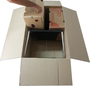 Richtig verpacken: Platzieren Sie den Stuhl mit dem Rücken liegend in den Karton. Damit der Karton von außen nicht zusammengedrückt werden kann, sollte der Leerraum gut ausgefüllt sein. Gut geeignet sind hierfür Bananenkisten oder Umzugskartons.